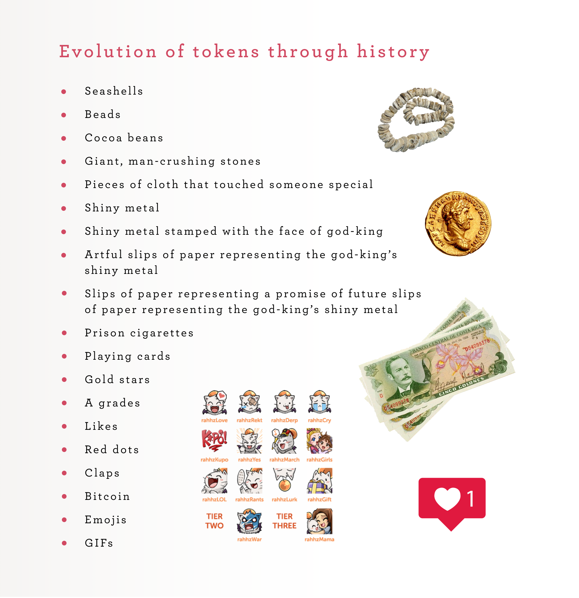 The coin, the dollar, the line of credit — money historically has been our favorite token, but the attention economy deals in likes, followers, and notifications as the tradable atoms of value. Social media has mapped our human impulses of creation and consumption onto these virtual tokens to form the latest gears of our capitalist engine. And if you want to know how these new types of economic gears work, it’s helpful to look at tokens and token design more broadly.